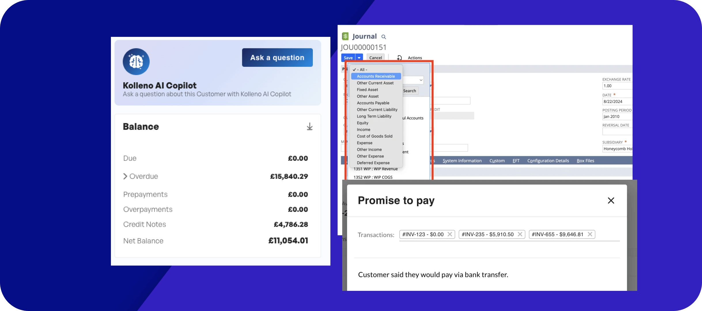 Kolleno AI-Copilot uses smart technology to apply payments for you. It directly connects your bank account feed and utilises Kolleno’s AI reconciliation module to find the best possible match and prevent any mismatches in the future. The system feeds back the payment status back to your accounting system and updates the records there.With just one click, your payments are reconciled and your accounting system is updated. –
