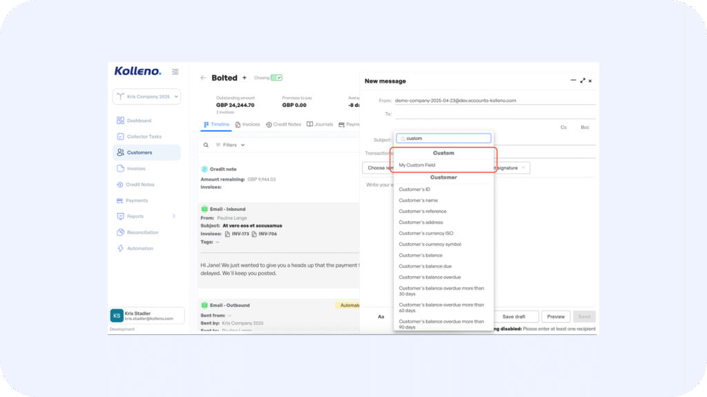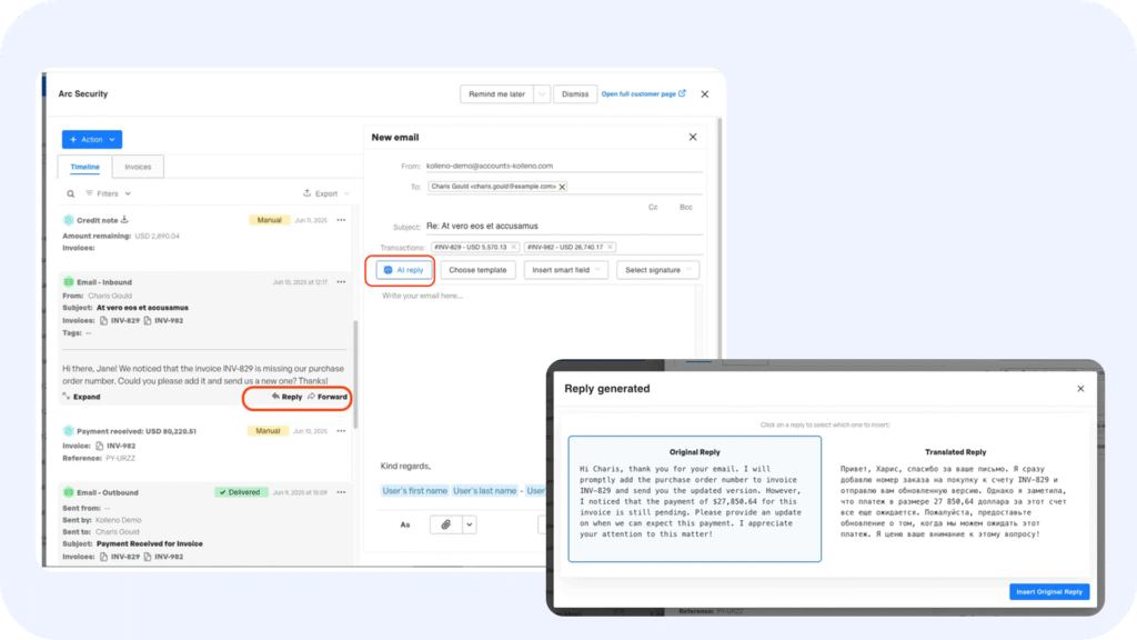 - Intelligent Email Drafting with Multilingual Support: The assistant automatically adjusts to your brand voice and includes relevant invoice details, payment context, and prior conversations — reducing manual effort while improving consistency across communications. The multilingual support ensures communications are always on point, no matter the customer’s language.