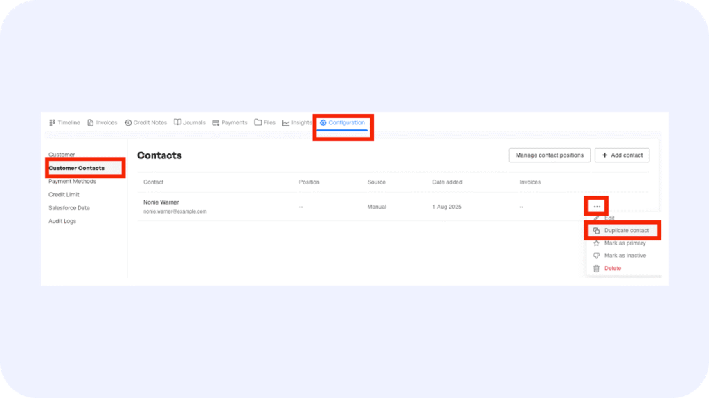 - Duplicate Contact Records: Reduce repetitive data entry with quick contact duplication, especially when similar contact structures appear across the customer.