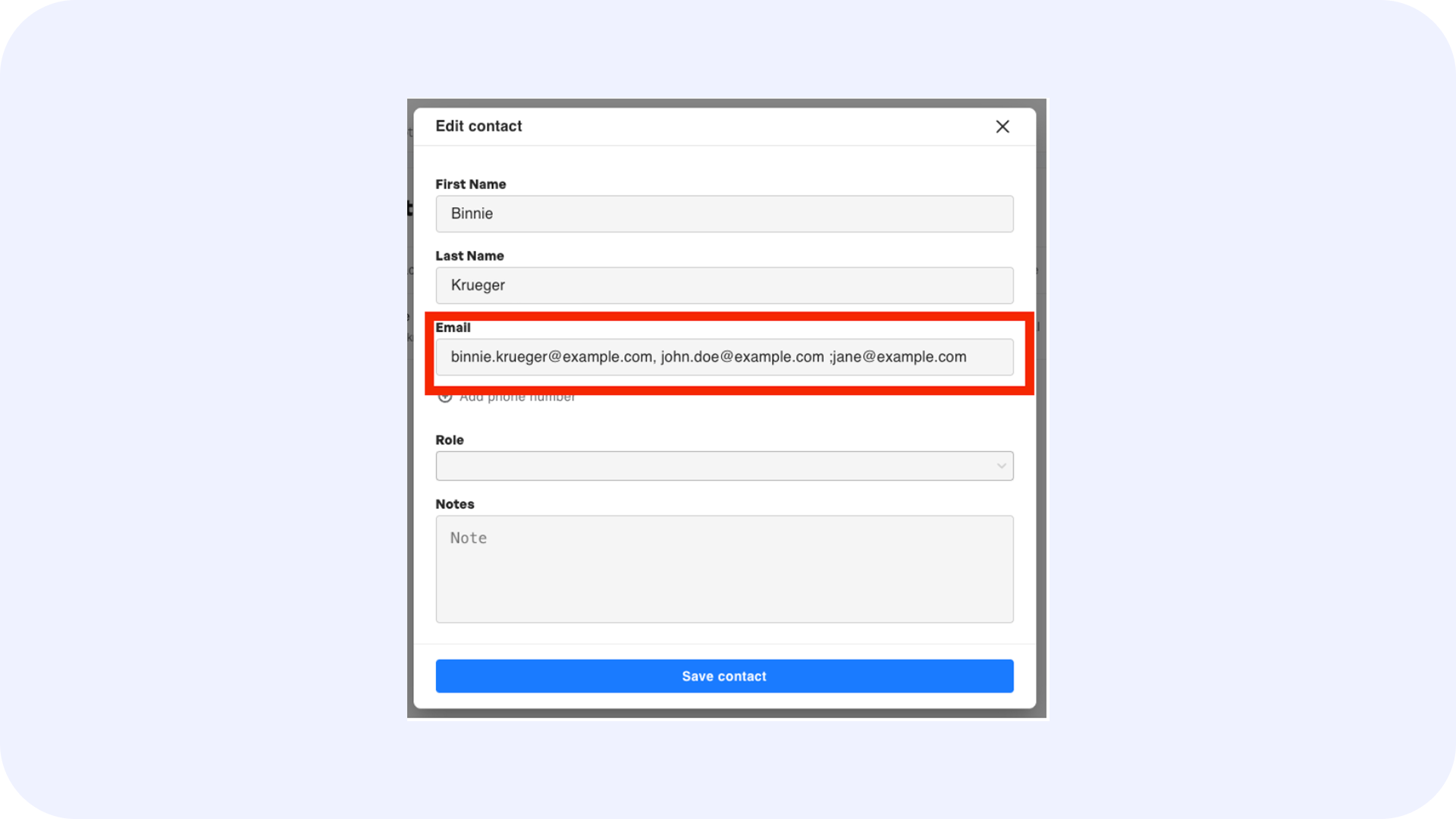 - Add Multiple Email Addresses to a Contact: Store multiple email addresses under one contact, ensuring you always reach the person if there are multiple emails that they should be contacted by.