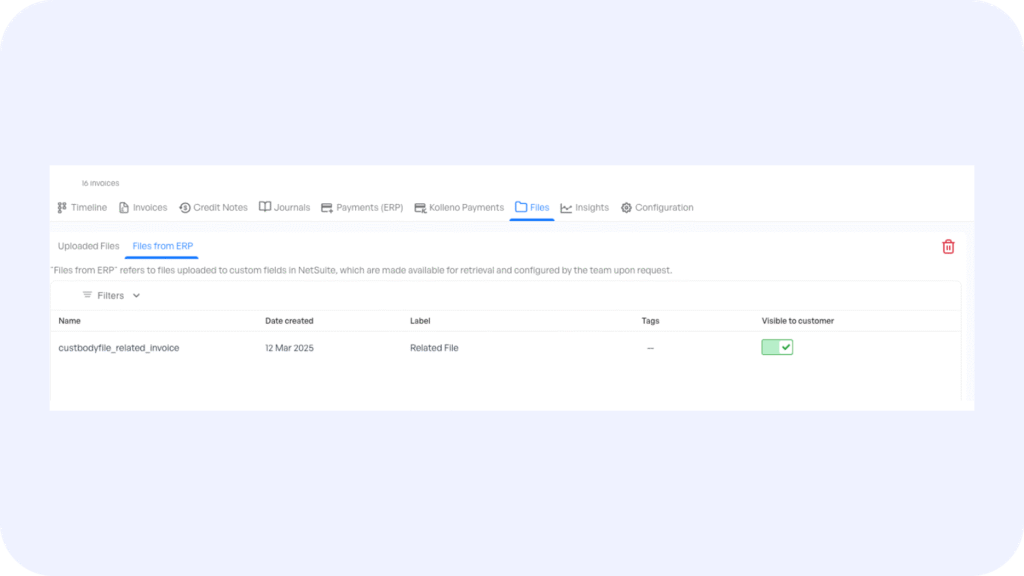 - Files from ERP (NetSuite): Understand how documents are transferred from NetSuite into Kolleno and where they appear in the system.