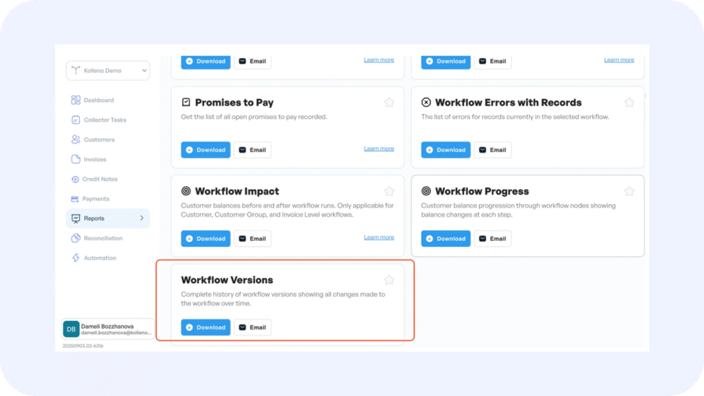 - Workflow Versions Report: View historical changes to your workflows—supporting internal audits and troubleshooting when logic evolves over time.