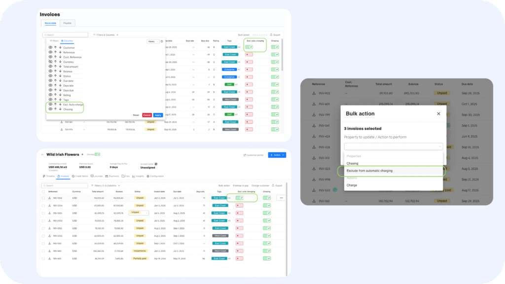 - Exclude invoices from automatic charging: You can now exclude specific invoices, individually or in bulk, from automatic charging, ideal for disputes or non-card payments.