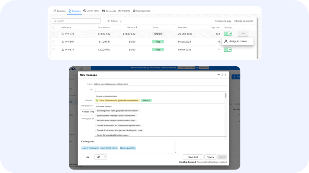 - View Assigned Contacts When Emailing an Invoice: When composing an email linked to an invoice, the assigned contacts now pop up at the top of the email screen, ensuring your message goes to the right recipient without searching.