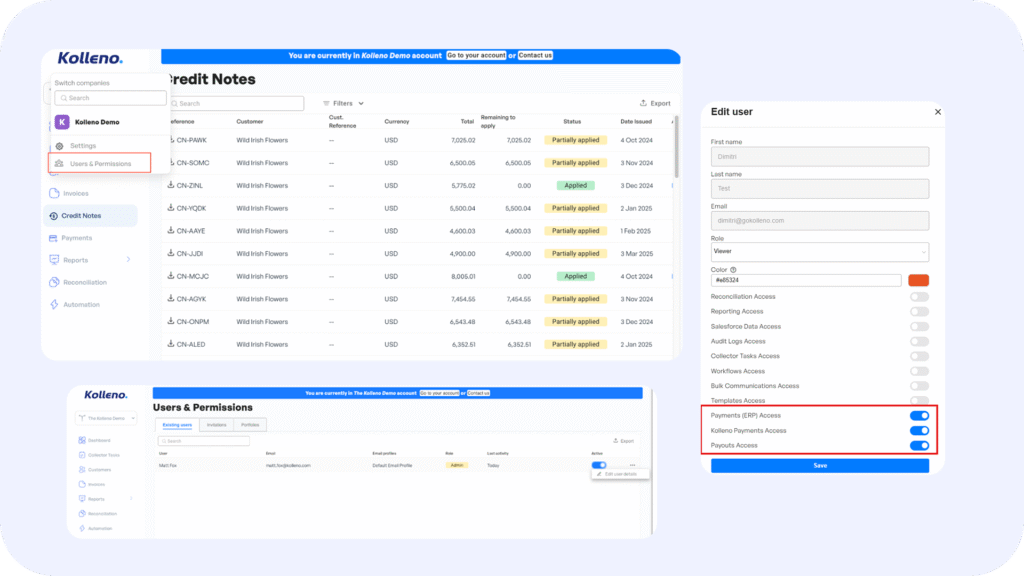 - Payments tab access: Admins can now control who sees and manages ERP Payments, Kolleno Payments, and Payouts — keeping sensitive payment data visible only to the right users.