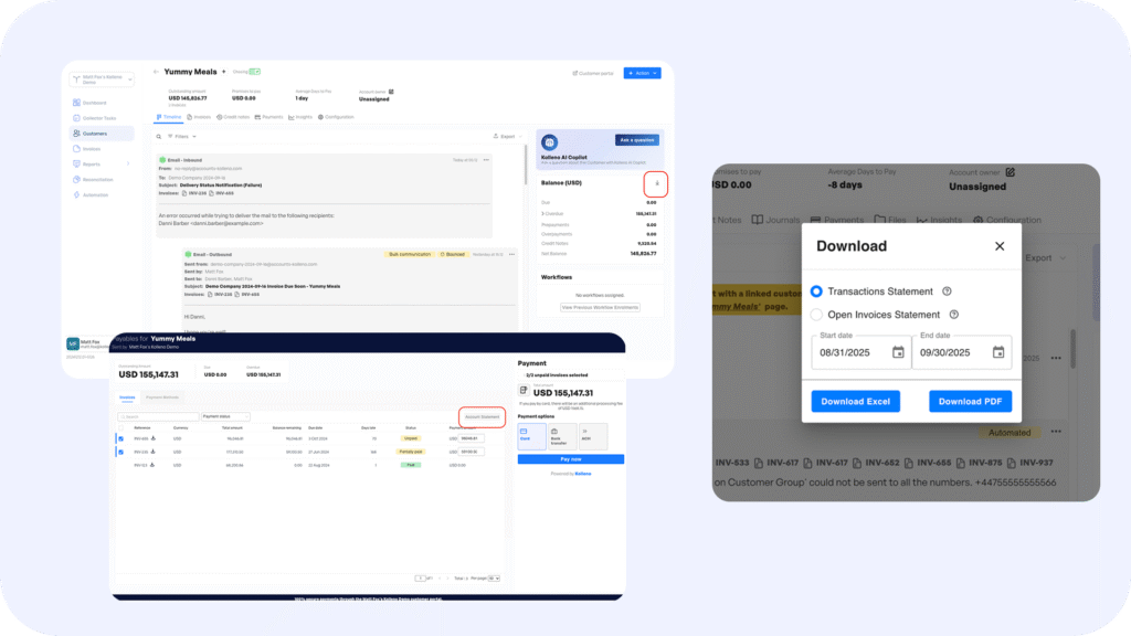 - Statements in Excel or CSV: Export customer statements directly from the app or portal, making it simple to share, reconcile, or analyze.